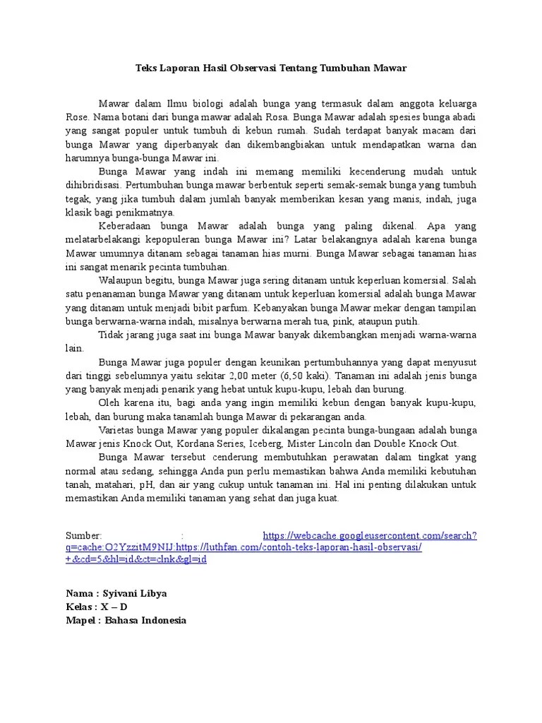 Contoh teks laporan hasil observasi singkat beserta strukturnya. Teks laporan hasil observasi lingkungan sekolah doc) laporan observasi. Informasi itu bisa meliputi objek tentang keadaan alam, keadaan lingkungan, hewan, tumbuhan, sosial, sebuah peristiwa, kesenian, dan kebudayaan. Jika pengamatan itu ditulis, akan membentuk yang disebut dengan teks . Hasil observasi beserta strukturnya contoh teks laporan observasi .