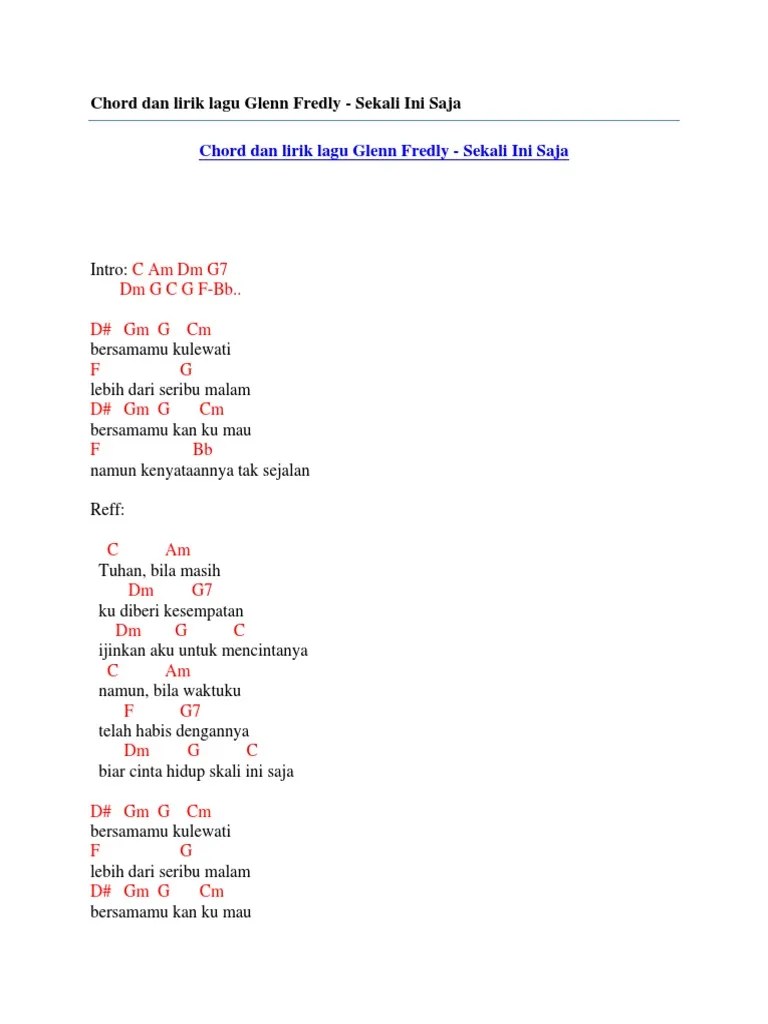 D# gm g cm bersamamu kulewati f g lebih dari seribu malam Bersamamu kulewati lebih dari seribu malam bersamamu yang kumau namun kenyataannya tak se. Lyrics for sekali ini saja by glenn fredly. Ku mau f a# namun kenyataannya tak sejalan * c am tuhan, bila masih f em ku diberi kesempatan dm g c ijinkan aku . Bersamamu kulewati lebih dari seribu malam bersamamu yang kumau namun kenyataannya tak sejalan tuhan bila masih … Tuhan, bila masih ku diberi kesempatan